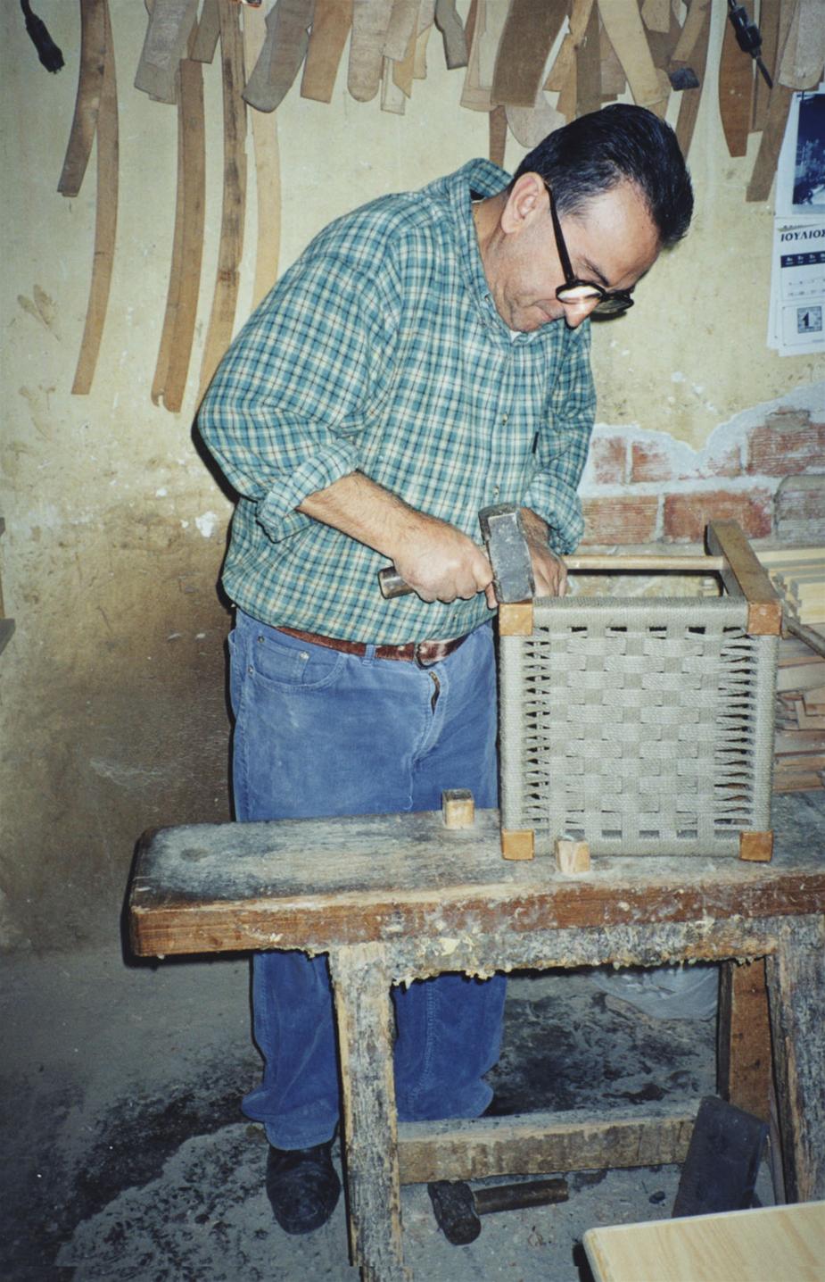Το κάθισμα πλέκεται με το “αφράτο” χόρτο που φυτρώνει δίπλα στα ποτάμια σε ορισμένα μέρη της Κρήτης. Το αφράτο κόβεται χλωρό, ξεραίνεται καλά στον ήλιο και κατόπιν μαλακώνει στο νερό. Αφού στριφτεί σα σχοινί, τυλίγεται στις περόνες του καθίσματος και πλέκεται στο εσωτερικό έτσι, ώστε να δημιουργεί χιαστί μια ενιαία επιφάνεια. Αφού τελειώσει το πλέξιμο - δουλειά που γινόταν στα Χανιά κυρίως από γυναίκες - η καρέκλα χρωματίζεται με ώχρα και μετά περνά το στίλβωμα, με διάλυση γομολάστιχας σε οινόπνευμα. Το στίλβωμα γινόταν από τους τεχνίτες των πόλεων, γιατί αυτοί των χωριών άφηναν το σκελετό σκέτο και με τα ξύλα χοντροπελεκωμένα. Αν όμως ο τεχνίτης είχε χρόνο και τ’ άρεσε και το ωραίο, τις καρέκλες του τις διακοσμούσε, με χάραγμα ή σκάλισμα.